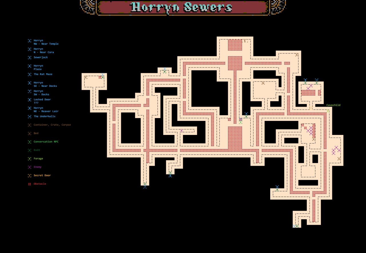 This guide provides a detailed map of the Horryn Sewers, a zone in SKALD: Against the Black Priory. The map is designed to help players navigate through the sewers, marking exits and important locations to avoid getting lost.